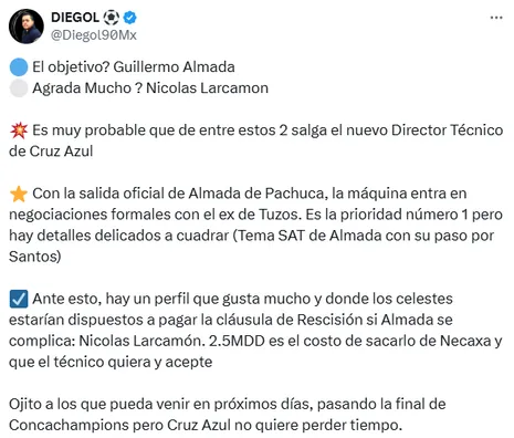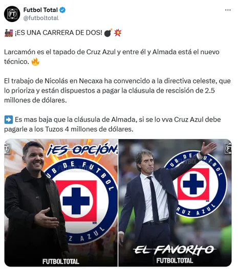 Por otro lado, según diversas fuentes, desde La Noria ya habrían iniciado contactos con Necaxa para conocer las condiciones por Nicolás Larcamón. El argentino, que llevó a los Rayos hasta la Liguilla en el último torneo, tiene contrato hasta diciembre de este año, por lo que Cruz Azul también tendría que desembolsar un pago para contar con él.