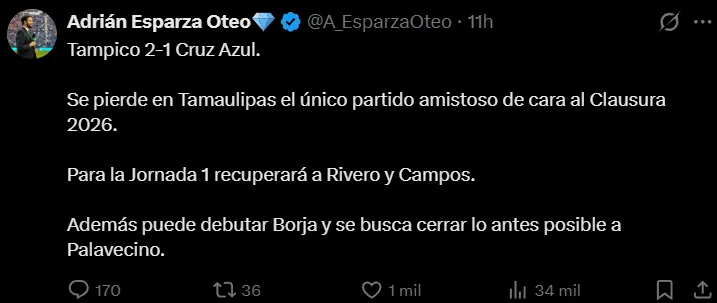 Cruz Azul dio un paso en falso en su primer y único amistoso de pretemporada, este domingo ante la Jaiba Brava en condición de visitante. A pesar de la derrota por 1-2 en la derrota DIF Altamira, los celestes no tienen tiempo que perder, y ya trabajan en lo que será el estreno en la jornada 1 del Torneo Clausura 2026.