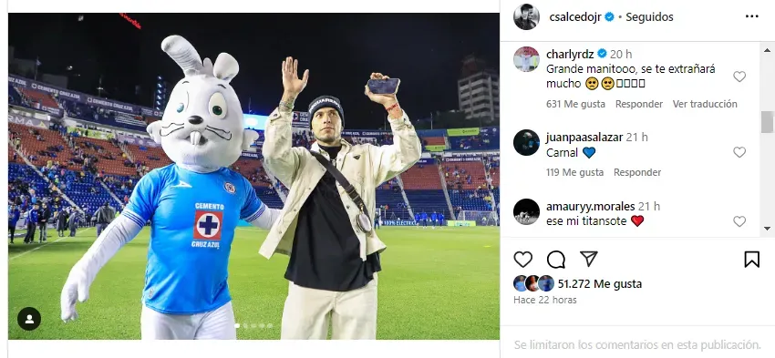 “Grande manito, se te extrañará mucho”, fue la respuesta de Charly Rodríguez para Carlos Salcedo. Mientras que el canterano celeste le dedicó un corazón y una frase en la que destaca el liderazgo del futbolista: “Ese mi Titansote”, escribió el juvenil de Cruz Azul.