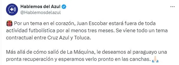 Está claro que resulta una noticia bastante fuerte debido a que Escobar es un futbolista muy respetado en la Liga MX. Aún así, lo positivo es que los médicos pudieron detectar el problema a tiempo y ahora el jugador tendrá la oportunidad de tratarse de la mejor manera. El plazo de 3 meses lo habría establecido el cuerpo médico de Toluca, pero ese tiempo podría extenderse dependiendo de cómo avance su recuperación en las próximas semanas.