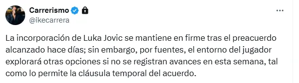 Las últimas horas han dejado entrever que Jović podría comenzar a evaluar otras opciones si el registro y la firma con Cruz Azul no se concretan en los próximos días. De acuerdo a reportes de periodistas como Gerardo González, revelan que “aún esperan a Jović y más por el primer acuerdo con el futbolista. Pero el entorno del jugador podría escuchar otras ofertas“.
