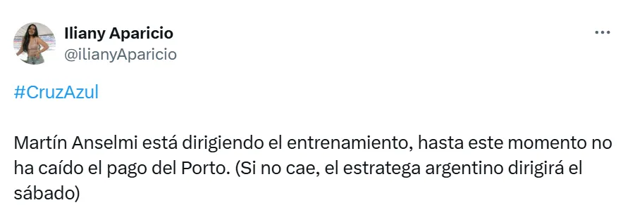 “Martín Anselmi está dirigiendo el entrenamiento, hasta este momento no ha caído el pago del Porto. (Si no cae, el estratega argentino dirigirá el sábado)“, escribió la reportera, respecto a la última actualización de la situación del entrenador argentino y su salida rumbo a Europa.
