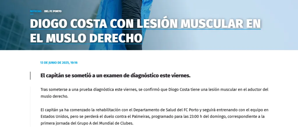 “El capitán ya ha comenzado la rehabilitación con el Departamento de Salud del FC Porto y seguirá entrenando con el equipo en Estados Unidos, pero se perderá el duelo contra el Palmeiras“, se lee en el comunicado,