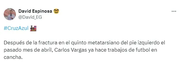 Así lo dio a conocer David Espinosa, periodista de Fox Sports, quien adelantó que el futbolista de 25 años de edad ya pudo realizar trabajos de cancha desde La Noria. “Después de la fractura en el quinto metatarsiano del pie izquierdo el pasado mes de abril, Carlos Vargas ya hace trabajos de futbol en cancha“, apuntó.