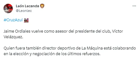 “Jaime Ordiales vuelve como asesor del presidente del club, Víctor Velázquez. Quien fuera también director deportivo de La Máquina está colaborando en la elección y negociación de los últimos refuerzos“, reveló el periodista de ESPN, León Lecanda.