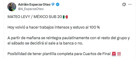 México enfrentará el próximo sábado 11 de octubre al ganador del duelo entre Argentina y Nigeria, y existe una posibilidad concreta de que Levy integre la convocatoria. Todo dependerá de cómo responda en los últimos entrenamientos y del visto bueno final del área médica. “El sábado se decidirá si sale a la banca o no“, señaló el reportero de TUDN.
