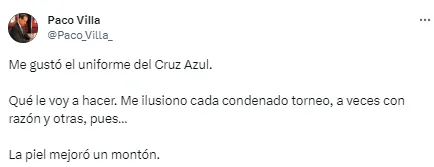 “Me gustó el uniforme del Cruz Azul. Qué le voy a hacer. Me ilusiono cada condenado torneo, a veces con razón y otras, pues… La piel mejoró un montón”, fue la opinión del narrador de TUDN tras la presentación de los uniformes, con el toque de ironía que lo caracteriza.
