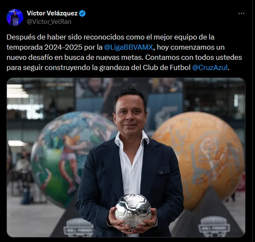 A través de sus redes sociales, el presidente del club, Víctor Velázquez, envió un mensaje a la afición: “Después de haber sido reconocidos como el mejor equipo de la temporada 2024-2025 por la Liga BBVA MX, hoy comenzamos un nuevo desafío en busca de nuevas metas. Contamos con todos ustedes para seguir construyendo la grandeza del Club de Futbol Cruz Azul”, expresó el ingeniero.