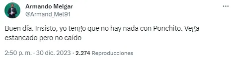 “Insisto, yo tengo que no hay nada con Ponchito”, le respondió el periodista a un usuario que le consultaba por la situación de los posibles refuerzos. Además, aclaró que el tema por Alexis Vega “está estancado pero no caído”.