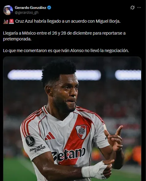 Según la información revelada por Vamos Azul, Cruz Azul llegó a un acuerdo total con Miguel Borja, delantero colombiano con amplio recorrido internacional, y ya tendría definida incluso su fecha de llegada a la Ciudad de México. El atacante arribaría entre el 26 y 28 de diciembre para firmar su contrato y sumarse a la pretemporada.