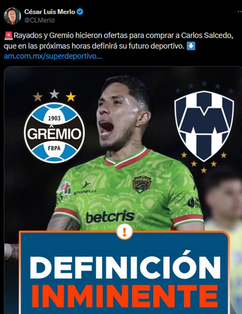 Ahora bien, en las últimas horas el periodista argentino César Luis Merlo reveló más novedades sobre el futuro del ex Tigres. A través de sus redes sociales, el reportero expresó: “Rayados y Gremio hicieron ofertas para comprar a Carlos Salcedo, que en las próximas horas definirá su futuro deportivo“.