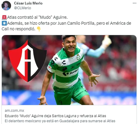El atacante regresó con el equipo de la Comarca Lagunera, aunque parece que no por mucho tiempo. Pues de acuerdo a información del periodista César Luis Merlo para Súper Deportivo, Eduardo Aguirre ya es nuevo refuerzo de Atlas para el Apertura 2023.
