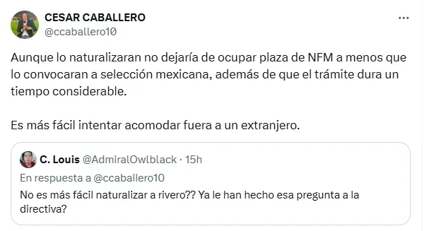 Una que tomaba fuerza entre los aficionados surgió en X y tuvo como destinatario al reportero César Caballero, cuando un usuario le consultó directamente: “¿No es más fácil naturalizar a Nacho Rivero?”. La lógica detrás de esa propuesta es entendible: Rivero lleva siete años en México (cinco de ellos en Cruz Azul y dos en Tijuana), por lo que su vínculo con el país es fuerte.