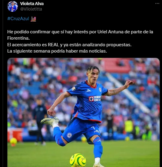 Según la información brindada por la periodista Violeta Alva en su cuenta personal de X, el conjunto violeta haría un acercamiento la próxima semana. “He podido confirmar que sí hay interés por Uriel Antuna de parte de la Fiorentina. El acercamiento es REAL y ya están analizando propuestas. La siguiente semana podría haber más noticias“, profesa el mensaje en la red social.
