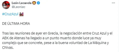 “Fuentes consultadas por ESPN aseguraron que a pesar de tener un preacuerdo desde hace varios días, (….) es la directiva del equipo griego la que ha frenado el acuerdo definitivo al buscar plazos de pago de entre tres y cuatro años, algo que los conjuntos de la Liga MX rechazaron de forma definitiva”, se puede leer en una nota firmada por el periodista León Lecanda.