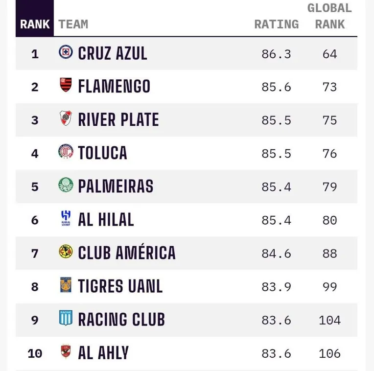Con una leve ventaja en cuanto a su inmediato perseguidor, Cruz Azul se sitúa en el primer puesto con 86.3 puntos, mientras que Flamengo, River Plate y Toluca lo siguen de cerca. Ahora bien, los de Nicolás Larcamón ocupan la plaza 64° en el ranking a nivel global y con los europeos incluidos.