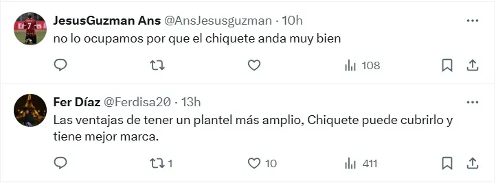 Se trata de Jesús Orozco Chiquete, y la posible ausencia de Gonzalo Piovi, que continúa trabajando por separado y aún no estaría al 100% físicamente, refuerza ese pedido. “No lo ocupamos por que el chiquete anda muy bien”, “No problem. Chiquete estuvo muy bien en el juego de ida” e “Igual y está chiquete que lo hizo muy bien, también piovi puede servir de revulsivo para poner orden si se necesita“, fueron algunos de los comentarios.