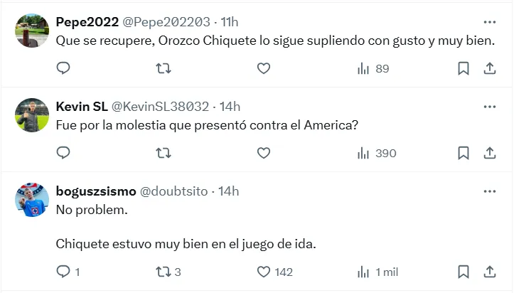 Se trata de Jesús Orozco Chiquete, y la posible ausencia de Gonzalo Piovi, que continúa trabajando por separado y aún no estaría al 100% físicamente, refuerza ese pedido. “No lo ocupamos por que el chiquete anda muy bien”, “No problem. Chiquete estuvo muy bien en el juego de ida” e “Igual y está chiquete que lo hizo muy bien, también piovi puede servir de revulsivo para poner orden si se necesita“, fueron algunos de los comentarios.