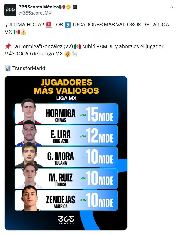 El impacto de su crecimiento no se limita a Cruz Azul. A nivel local, Erik Lira ya se ubica como el segundo jugador más valioso de toda la Liga MX. Solo es superado por la Hormiga González, quien lidera el ranking con 15 millones de euros. Por detrás de Lira aparecen nombres como Gilberto Mora (10 MDE) y otros talentos que también empujan fuerte en el mercado.