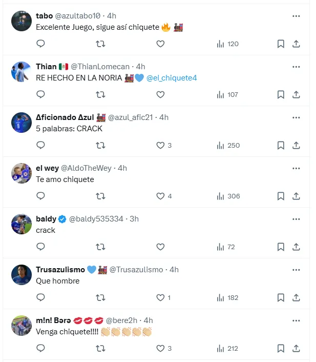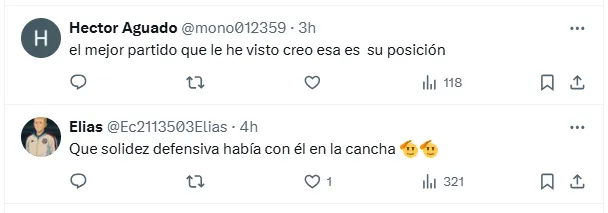 Su actuación no pasó desapercibida para la afición. Los seguidores de La Máquina se volcaron en las redes sociales y las reacciones reflejaron la admiración por su desempeño. Muchos destacaron su seguridad en la defensa, mientras que otros lo llenaron de puros elogios: “Eduque Chiquete”.