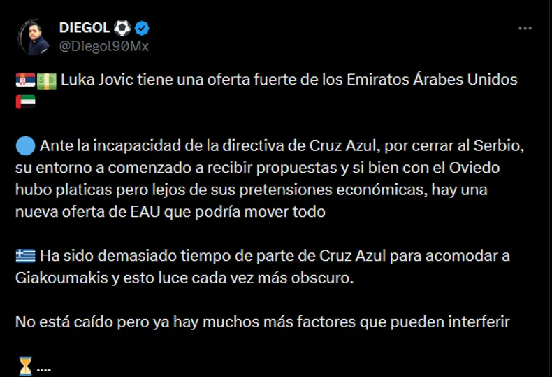 Según reveló el periodista Diego Sánchez en X, el europeo tiene a otro interesado en sus servicios. “Luka Jovic tiene una oferta fuerte de los Emiratos Árabes Unidos. Ante la incapacidad de la directiva de Cruz Azul, por cerrar al Serbio, su entorno a comenzado a recibir propuestas y si bien con el Oviedo hubo platicas pero lejos de sus pretensiones económicas, hay una nueva oferta de EAU que podría mover todo“.