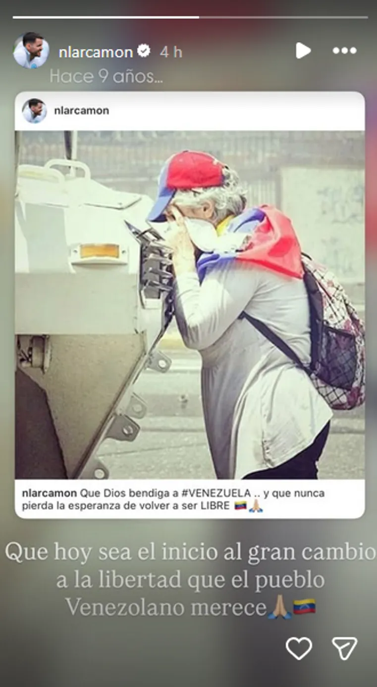 A través de su cuenta de Instagram, Larcamón compartió una imagen cargada de simbolismo donde se observa a una ciudadana venezolana frente a un vehículo blindado. “Que hoy sea el inicio al gran cambio a la libertad que el pueblo venezolano merece“, escribió el técnico, acompañando sus palabras con emojis de oración y la bandera tricolor.