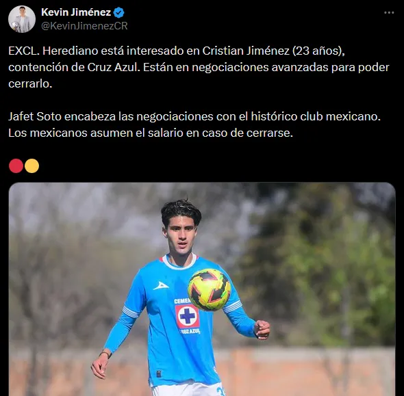 Fue el periodista Kevin Jiménez quien reveló este posible movimiento, a través de su cuenta de X. El destino del futbolista estaría en el futbol de Centroamérica, puntualmente en el Herediano de Costa Rica. “Está interesado en Cristian Jiménez (23 años), contención de Cruz Azul. Están en negociaciones avanzadas para poder cerrarlo”.