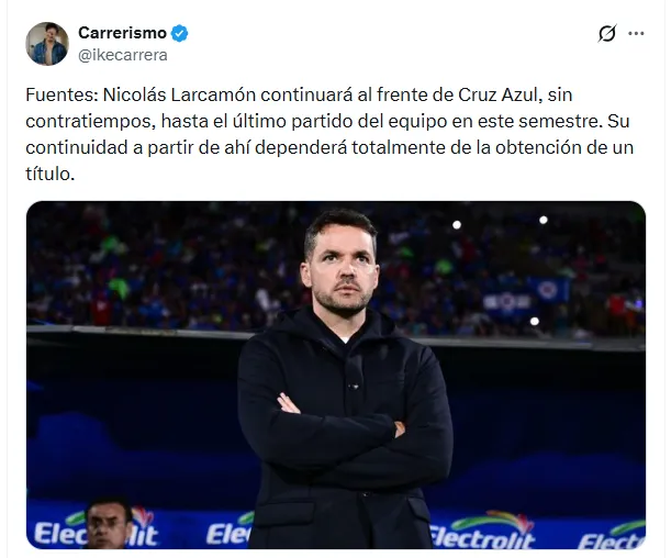 Sin embargo, un posteo del insider Ike Carrera fue el que trajo claridad en medio del caos. “Nicolás Larcamón continuará al frente de Cruz Azul, sin contratiempos, hasta el último partido del equipo en este semestre”, escribió Carrera, confirmando que la dirigencia respalda al entrenador por ahora.