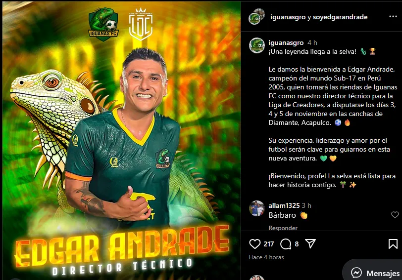 “¡Una leyenda llega a la selva! Le damos la bienvenida a Édgar Andrade, campeón del mundo Sub-17 en Perú 2005, quien tomará las riendas de Iguanas FC como nuestro director técnico. Su experiencia, liderazgo y amor por el futbol serán clave para guiarnos en esta nueva aventura. ¡Bienvenido, profe! La selva está lista para hacer historia contigo”, anunció oficialmente el club en Instagram.
