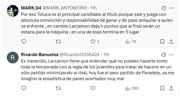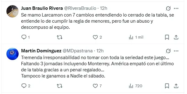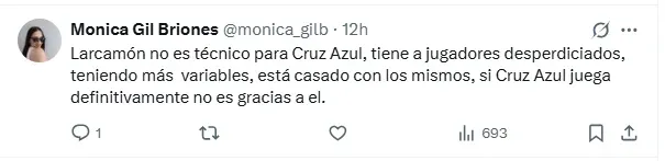 Incluso se critica que “Larcamón no es técnico para Cruz Azul. Tiene jugadores desperdiciados, está casado con los mismos”. “Larcamón no puede salir con un equipo alterno cuando te estás jugando el liderato, hoy era ganar sí o sí, por sus mmds se cayó al tercer o cuarto lugar”, señalaron algunos, reflejando un sentimiento generalizado de frustración entre los seguidores.