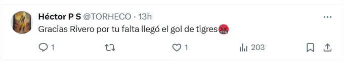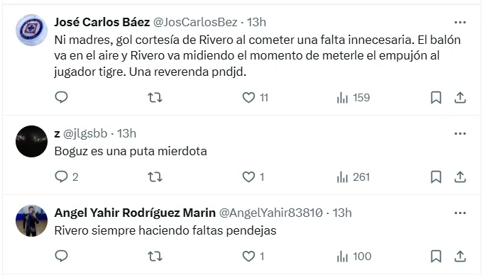 “Ni madres, gol cortesía de Rivero al cometer una falta innecesaria. El balón va en el aire y Rivero va midiendo el momento de meterle el empujón al jugador tigre. Una reverenda pndjd”, escribió otro aficionado en X. “Rivero siempre haciendo faltas pendejas“, fue otra. Incluso hubo quien ironizó: “Gracias Rivero, por tu falta llegó el gol de Tigres”.