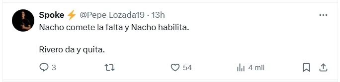 A pesar de que Willer Ditta fue muy cuestionado por su actuación general, las redes sociales se encendieron apuntando a Rivero como el verdadero responsable del empate y las opiniones fueron tajantes contra el capitán. “Nacho comete la falta y Nacho habilita. Rivero da y quita”, resumió la bronca.