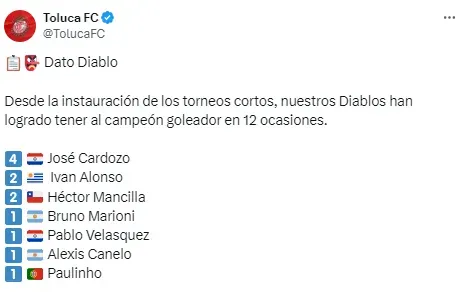 “Desde la instauración de los torneos cortos, nuestros Diablos han logrado tener al campeón goleador en 12 ocasiones, presumió el conjunto mexiquense, colocando al ahora director deportivo cementero entres u privilegiada lista y por partida doble.