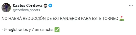 Y es que, a pesar de que trascendió que a partir de este torneo habría una reducción de extranjeros permitidos en cada equipo, de acuerdo con información del periodista Carlos Córdova no sería así, pues así habría quedado confirmado en la última junta de dueños.