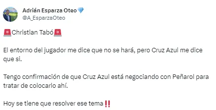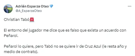 “El entorno del jugador me dice que es falso que exista un acuerdo con Peñarol. Peñarol lo quiere, pero Tabó no se quiere ir de Cruz Azul (le resta año y medio de contrato)”, fue la información revelada por el periodista acerca de Christian Tabó.