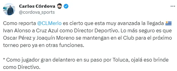 “Como reporta César Luis Merlo, es cierto que está muy avanzada la llegada de Iván Alonso a Cruz Azul como Director Deportivo. Lo más seguro es que Óscar Pérez y Joaquín Moreno se mantengan en el Club para el próximo torneo pero ya en otras funciones”, fue la información que brindó el periodista en las últimas horas, tras darse a conocer la posible llegada del uruguayo a Cruz Azul.