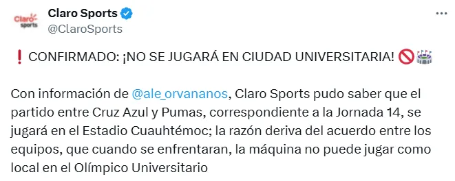 Fue el periodista Alejandro Orvananos, a través de Claro Sports, quien confirmó la mudanza de Cruz Azul para enfrentar a Pumas en la Jornada 14. Hay que recordar que esto ocurre por el acuerdo entre ambos equipos en el que prestaban el CU a los cementeros por el torneo a excepción de ese único encuentro.