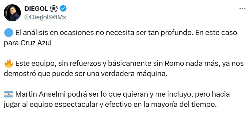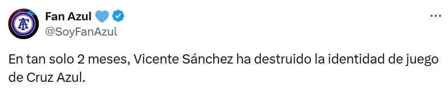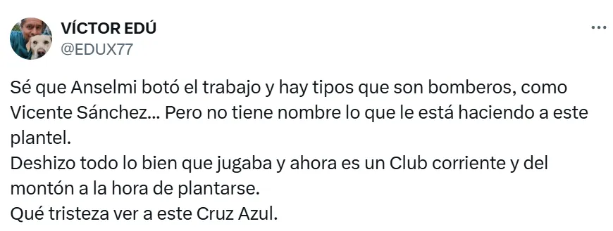 “Sé que Anselmi botó el trabajo y hay tipos que son bomberos, como Vicente Sánchez... Pero no tiene nombre lo que le está haciendo a este plantel. Deshizo todo lo bien que jugaba y ahora es un club corriente y del montón a la hora de plantarse. Qué tristeza ver a este Cruz Azul”, escribió el periodista Víctor Edú.
