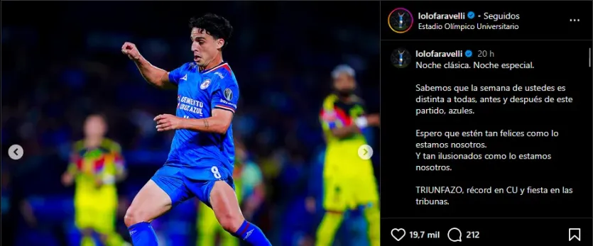 Horas más tarde de ello y justo en la antesala del cotejo ante Necaxa del próximo martes, diferentes protagonistas se siguieron expresando después del Clásico Joven. Uno de ellos fue Lorenzo Faravelli, quien fue titular ante los de coapa y se encargó de dejar un mensaje para los fanáticos cementeros a través de su Instagram.