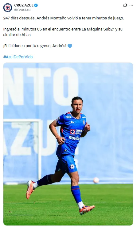 Después de meses de recuperación, Andrés Montaño finalmente regresó a la actividad futbolística. Tras la grave lesión de ligamento cruzado anterior y meniscos de la rodilla izquierda que sufrió el 11 de mayo de 2025, el mediocampista tuvo minutos con la Sub-21 este martes 13 de enero.