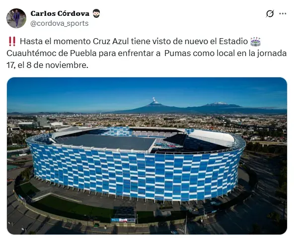 Como ya ocurrió en el Torneo Clausura 2025, el enfrentamiento entre Cruz Azul y Pumas que tiene a los de Larcamón como locales, no se jugará en Ciudad Universitaria. De acuerdo al periodista Carlos Córdova, antiguo jefe de prensa de La Máquina, el recinto elegido para el juego sería nuevamente el Cuauhtémoc, del Puebla.