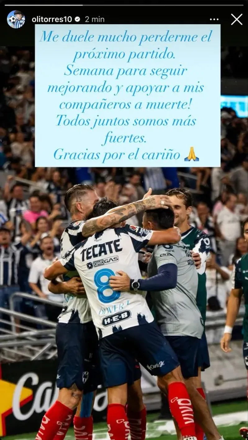 Horas más tarde el ibérico rompió el silencio en sus redes sociales y compartió un mensaje para su hinchada. “Me duele mucho perderme el próximo partido (Clásico Regio). Semana para seguir mejorando y apoyar a mis compañeros a muerte. Todos juntos somos más fuertes. Gracias por el cariño”, expresó Torres en una historia publicada en su cuenta de Instagram.