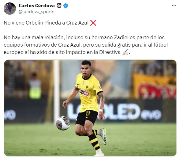 “No viene Orbelin Pineda a Cruz Azul. No hay una mala relación, incluso su hermano Zadiel es parte de los equipos formativos de Cruz Azul, pero su salida gratis para ir al futbol europeo sí ha sido de alto impacto en la directiva“, explicó el también exdirector de comunicación del equipo celeste.