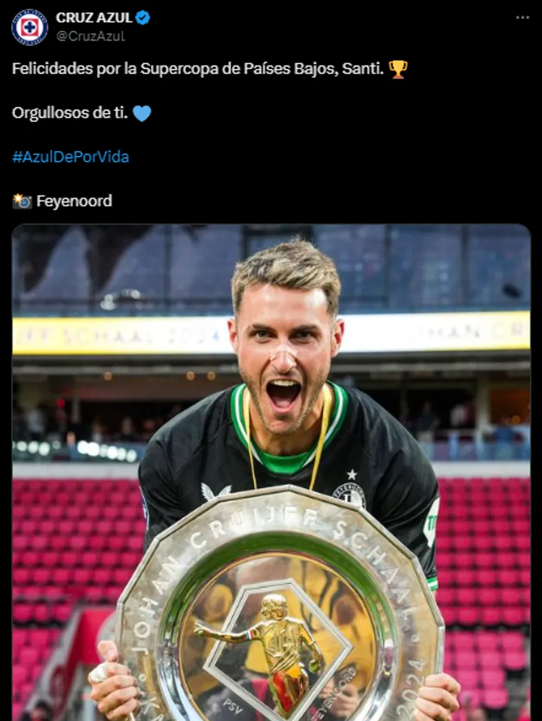 Quien no quiso quedarse afuera de los festejos es el propio Cruz Azul, quien a través de su cuenta oficial de X felicitó al delantero de forma cálida: “Felicidades por la Supercopa de Países Bajos, Santi. Orgullosos de ti“, exclamó con una serie de emojis. Allí se puede ver el Bebote levantando el plato de campeón jocosamente.