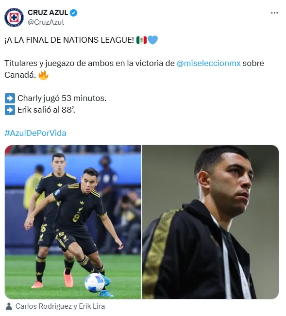 Las dos piezas claves en Cruz Azul actuaron en el mediocampo de gran manera. Charly jugó 53 minutos y salió por un ex cementero, Luis Romo; mientras que Lira estuvo casi todo el partido en campo. Esto les valió que club saliera a presumir luego de su rendimiento en las redes sociales: “Titulares y juegazo de ambos en la victoria de México sobre Canadá“.