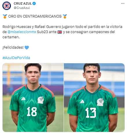 Con todo el sello y el orgullo de la cantera de Cruz Azul, Rodrigo Huescas y Rafael Guerrero se consagraron campeones con la Selección de México en los Juegos Centroamericanos 2023, por lo que pronto regresarán a La Noria con la Medalla de Oro en el cuello.