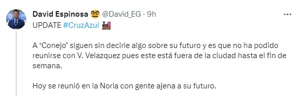 “A Conejo siguen sin decirle algo sobre su futuro y es que no ha podido reunirse con Víctor Velázquez, pues este está fuera de la ciudad hasta el fin de semana”, dio a conocer el periodista, a través de su cuenta de Twitter, acerca de la situación actual desde La Noria, en la previa de confirmar los primeros movimientos, de cara al Clausura 2024.