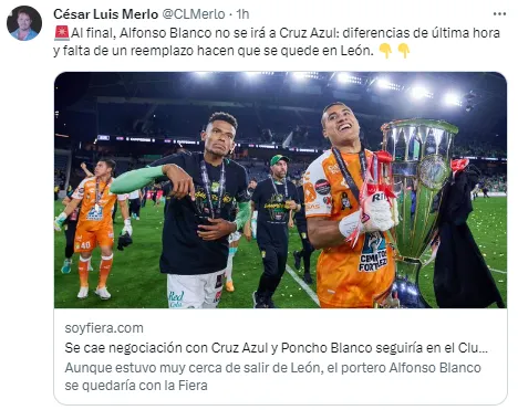 La fuente citada sostiene que en Guanajuato no estaban convencidos de dejar salir a Alfonso Blanco y quedarse con Rodolfo Cota como único experimentado, lo cual obligaba a salir al mercado en la búsqueda de un reemplazo. Por si fuera poco, León disputará en este semestre la Liga MX, Leagues Cup y Mundial de Clubes.