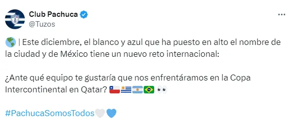 “Este diciembre, el blanco y azul que ha puesto en alto el nombre de la ciudad y de México tiene un nuevo reto internacional”, publicó Pachuca a través e su cuenta de X, lanzando una clara indirecta al equipo cementero, que desde 1971 dejó Hidalgo para mudarse a la Ciudad de México.