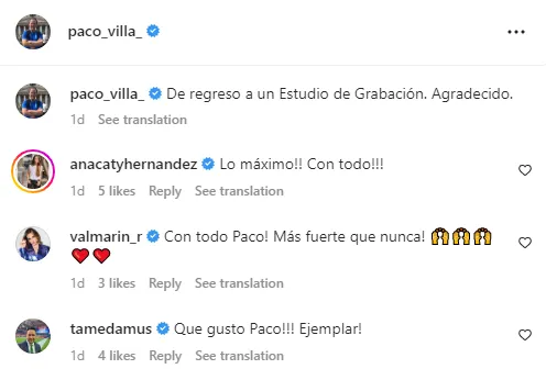 No obstante, en las últimas horas Paco Villa reapareció en las redes sociales, con una postal en la que dio a conocer que por fin había regresado a un estudio de grabación, la cual lo dejó ver con mucho mejor aspecto, lo que daría clara puebla de que afortunadamente está gozando de buena salud.